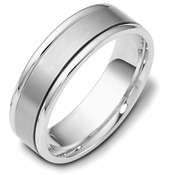 14 kt white gold, hand made comfort fit Wedding Band 6.5 mm wide. The center is a matte finish and the outer edges are polished. Different finishes may be selected or specified.