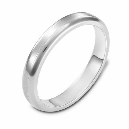 14 kt white gold, hand made comfort fit Wedding Band 4.0 mm wide. The center is a matte finish and the outer edges, polished. Different finishes may be selected or specified.