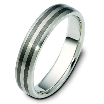 14 kt white gold and titanium , comfort fit, 5.0 mm wide wedding band. The whole ring is a matte finish. Different finishes may be selected or specified.
