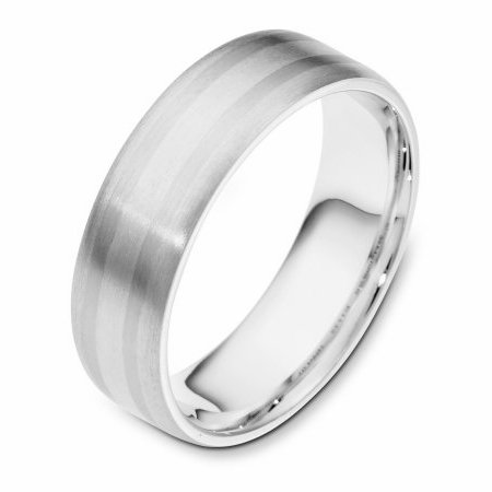 18 kt white gold, hand made comfort fit Wedding Band 6.5 mm wide. The whole ring is a matte finish. Different finishes may be selected or specified.