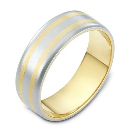 18 kt two-tone hand made comfort fit Wedding Band 6.5 mm wide. The whole ring is a matte finish. Different finishes may be selected or specified.
