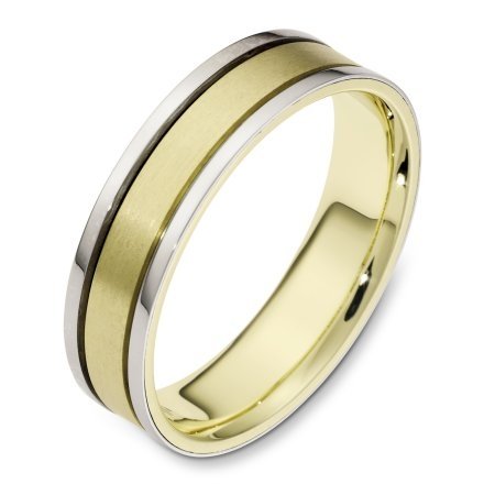 18 kt two-tone hand made comfort fit Wedding Band 5.5 mm wide. The center is a matte finish and the outer edges are polished. Different finishes may be selected or specified.