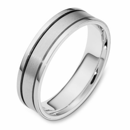 18 kt white gold, hand made comfort fit Wedding Band 5.5 mm wide. The center is a matte finish and the outer edges are polished. Different finishes may be selected or specified.