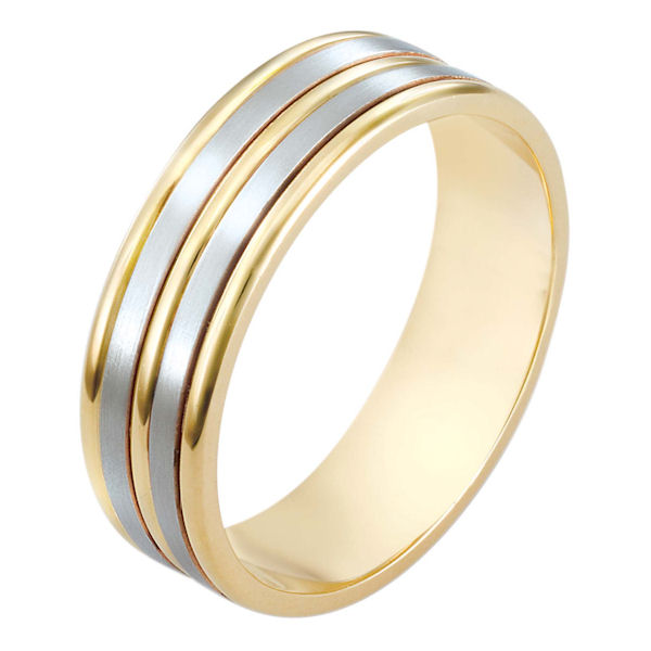 14 kt two-tone hand made comfort fit Wedding Band 6.5 mm wide. The two flat pieces in the band have a matte finish. The rest of the has a polished. Different finishes may be selected or specified.