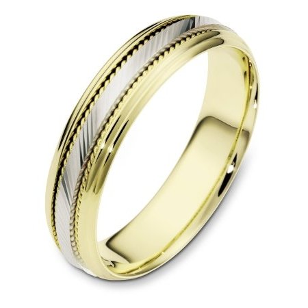 14 kt two-tone hand made, wedding band 5.5 mm wide. The center of the ring has a design with milgrain on each side of the design. The whole ring is polished. Different finishes may be selected or specified.