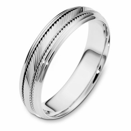 Platinum hand made, wedding band 5.5 mm wide. The center of the ring has a design with milgrain on each side of the design. The whole ring is polished. Different finishes may be selected or specified.