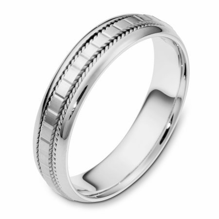 18 kt white gold, hand made comfort fit Wedding Band 5.0 mm wide. The center of the ring has a design with milgrain on each side. The whole ring is polished. Different finishes may be selected or specified.