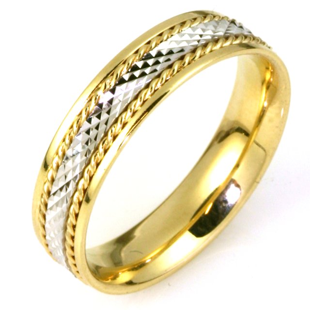 18 kt two-tone hand made 5.5 mm wide comfort fit, crosscut center Wedding Band. The center of the band has a crosscut design with a handmade rope on each side. The whole ring is polished. Different finishes may be selected or specified.