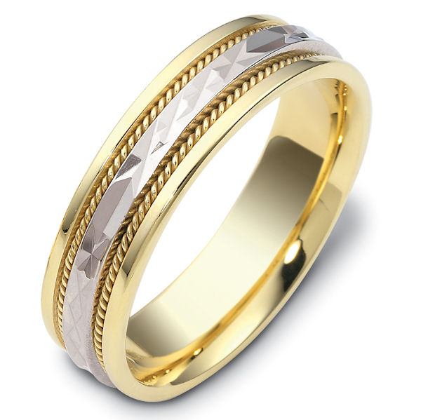18 kt two-tone hand made comfort fit Wedding Band 6.0 mm wide. The center of the ring has a design with a handmade rope on each side. The whole ring is polished. Different finishes may be selected or specified.