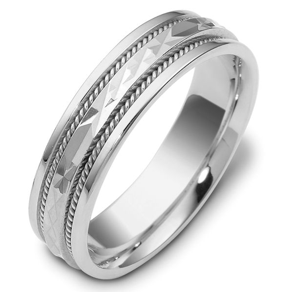 Platinum hand made comfort fit Wedding Band 6.0 mm wide. The center of the ring has a design with a handmade rope on each side. The whole ring is polished. Different finishes may be selected or specified.