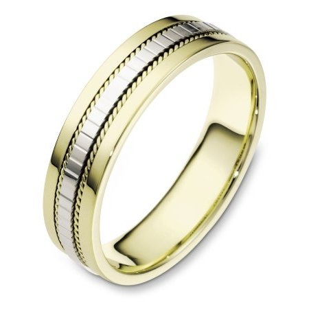 14 kt two-tone hand made, comfort fit Wedding Band 5.5 mm wide. The center of the ring has a design with a handmade rope on each side. The whole ring is polished. Different finishes may be selected or specified.