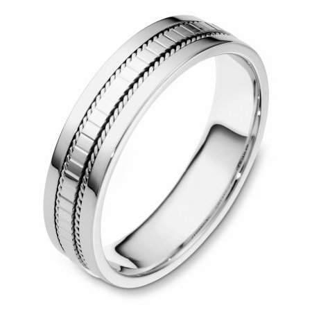Platinum hand made, comfort fit Wedding Band 5.5 mm wide. The center of the ring has a design with a handmade rope on each side. The whole ring is polished. Different finishes may be selected or specified.