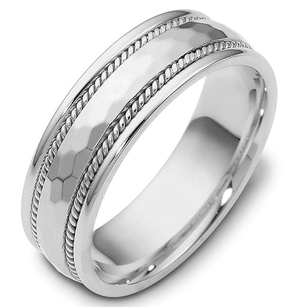 Platinum hand made comfort fit, hammer finish, Wedding Band 7.5 mm wide. The center of the ring has a hammered matte finish with one handmade rope on each side. The rest of the ring is polished. Different finishes may be selected or specified