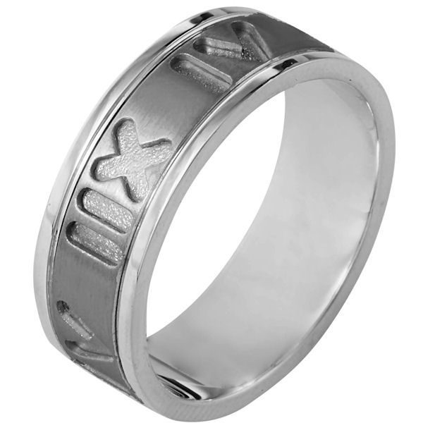 14K White gold and titanium, Spinning Comfort Fit, 7.5 mm wide, center rotating ring. The center of the band has carved roman numerial numbers all around the band and spins. It is a matte finish in the center and polished on the outer edges. Different finishes may be selected or specified.