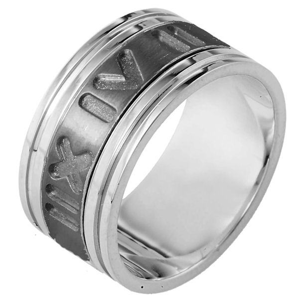 14K White gold and titanium, Spinning Comfort Fit, 11.0 mm wide, center rotating ring. The center of the band has carved roman numerial numbers all around the band and spins. It is a matte finish in the center and polished on the outer edges. Different finishes may be selected or specified.