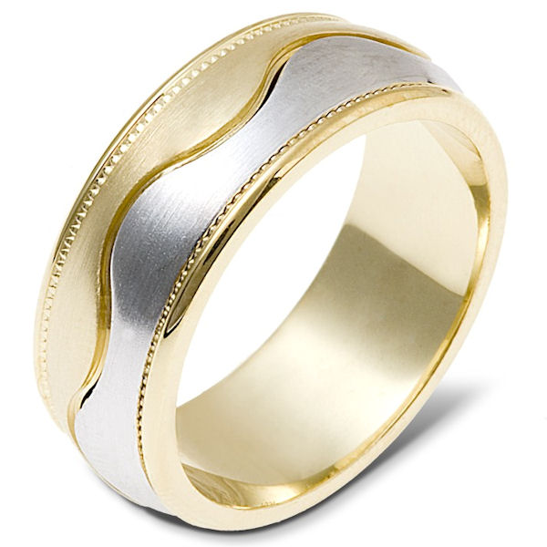 18 kt two-tone hand made comfort fit Wedding Band 8.0 mm wide. The ring has a milgrain on each side of the band. The center is matte and the outer edges are polished. Different finishes may be selected or specified.