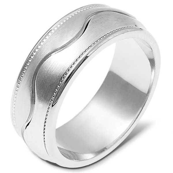 Platinum hand made comfort fit Wedding Band 8.0 mm wide. The ring has a milgrain on each side of the band. The center is matte and the outer edges are polished. Different finishes may be selected or specified.