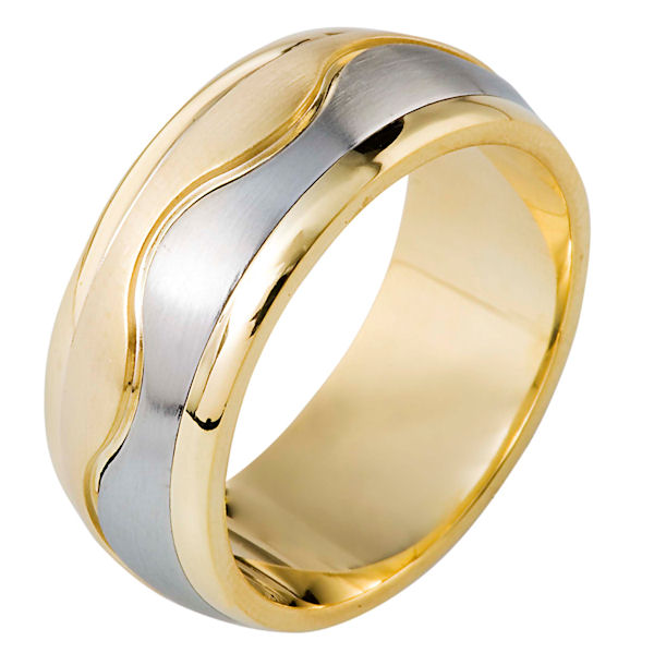 14 kt two-tone hand made comfort fit Wedding Band 9.0 mm wide. The ring has a carved curvy line in the center. The center of the ring is matte and the outer edges are polished. Different finishes may be selected or specified.