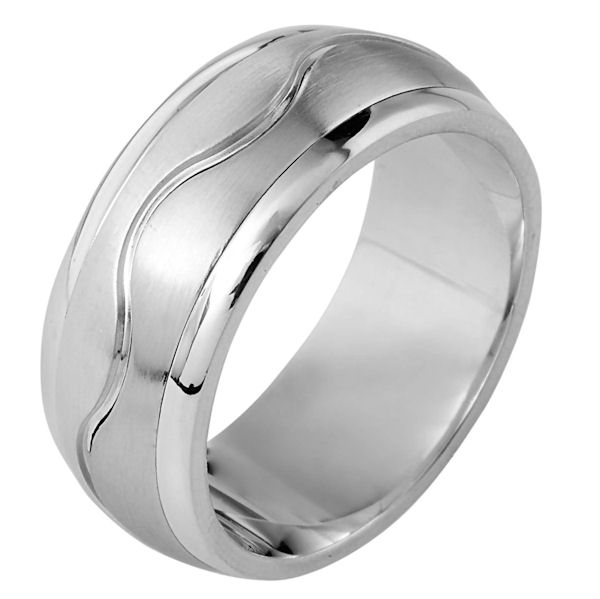 18 kt white gold, hand made comfort fit Wedding Band 9.0 mm wide. The ring has a carved curvy line in the center. The center of the ring is matte and the outer edges are polished. Different finishes may be selected or specified.