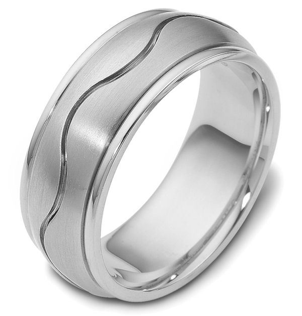 14 kt white gold, hand made comfort fit Wedding Band 8.5 mm wide. The ring has a carved curvy line in the center. The center of the ring is matte and the outer edges are polished. Different finishes may be selected or specified.