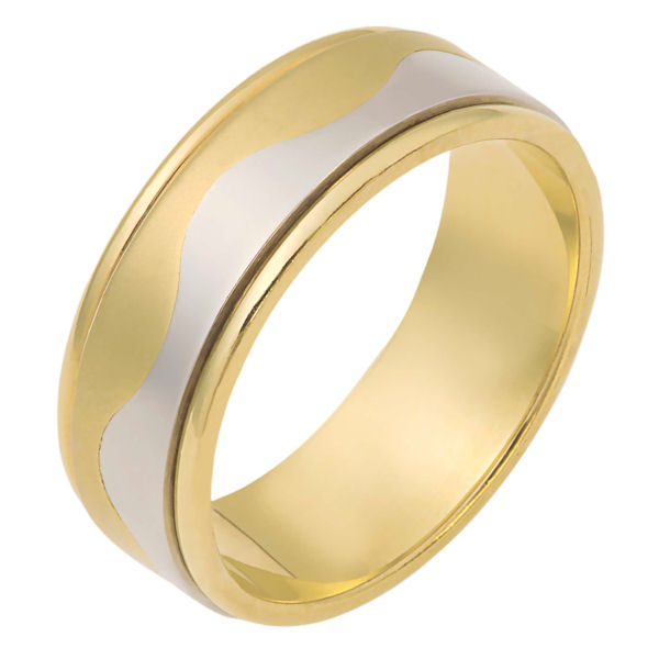 18 kt two-tone hand made comfort fit Wedding Band 7.5 mm wide. The ring is flat and a curvy carved line lies in the center. The center of the ring is matte finish and the outer edges are polished. Different finishes may be selected or specified.