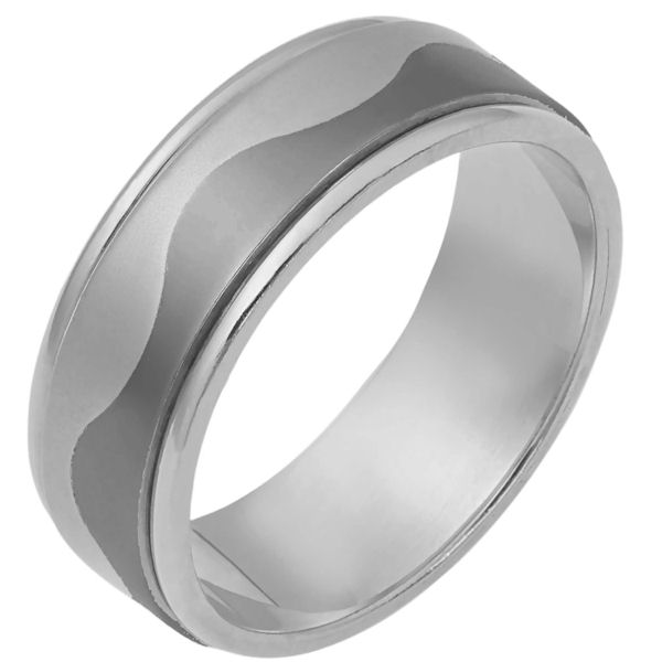 14K White gold and titanium, comfort fit, 7.5 mm wide ring. The ring is flat and a curvy carved line lies in the center. The center of the ring is matte finish and the outer edges are polished. Different finishes may be selected or specified.