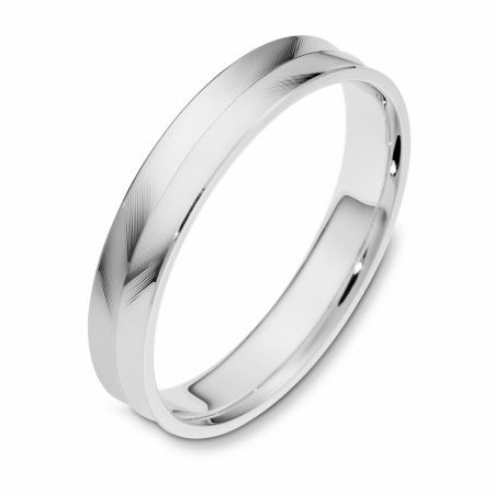 18 kt white gold, 4.0 mm wide, carved, comfort fit, wedding band. The ring has a herringbone carved pattern on the band. The whole ring is polished. Different finishes may be selected.