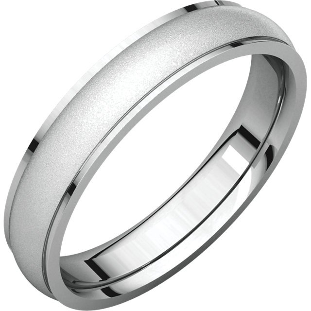 18K white gold, center satin-finish, 5.0 mm wide plain wedding band. The center of the ring is a satin brush finish and the edges are polished. Different finishes may be selected or specified.