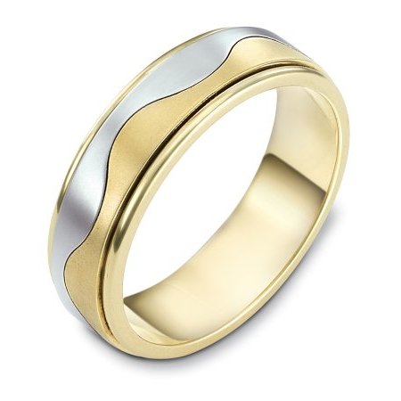 14 kt two-tone hand made comfort fit Wedding Band 6.0 mm wide. The ring is flat and a curvy line is carved in the center. The center of the ring is matte and the edges are polished. Different finishes may be selected or specified.