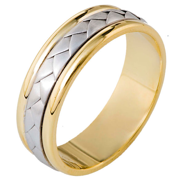 14 kt hand made comfort fit Wedding Band 6.5 mm wide. The center of the ring has a hand made braid which has a brushed finish. The outer edges are polished. Different finishes may be selected or specified.