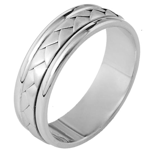 Platinum hand made comfort fit Wedding Band 6.5 mm wide. The center of the ring has a hand made braid which has a brushed finish. The outer edges are polished. Different finishes may be selected or specified.