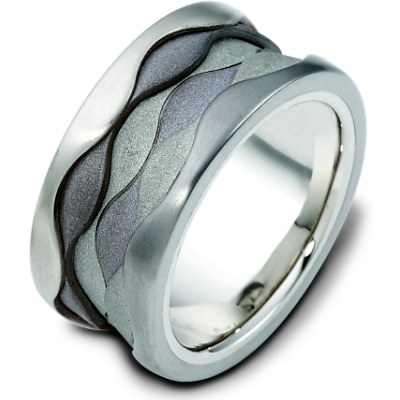 14K White gold and titanium, comfort fit, 11.5 mm wide ring. The center portion of the ring has a mixture of coarse and heavy sandblast matte finishes. Different finishes may be selected or specified.