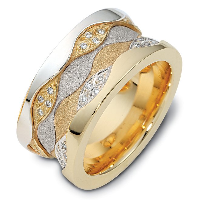 11.5 mm wide 14K two tone comfort fit, 3 mm thick, diamond band, 0.50 ct tw. in size 6.0. The diamonds are VS1-2 in clarity and G-H in color. The center portion of the ring has a mixture of coarse and heavy sandblast finishes. The edges are polished. Different finishes may be selected or specified.