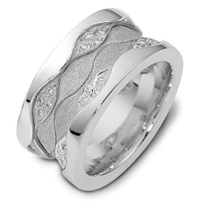 11.5 mm wide 18K white gold, comfort fit, 3 mm thick, diamond band, 0.50 ct tw. in size 6.0. The diamonds are VS1-2 in clarity and G-H in color. The center portion of the ring has a mixture of coarse and heavy sandblast finishes. The edges are polished. Different finishes may be selected or specified.