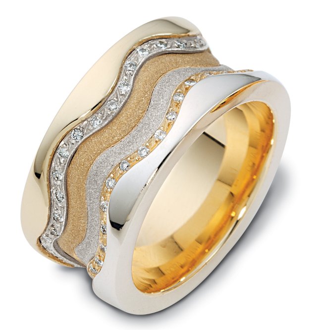 14K two tone 11.5 mm wide, 3 mm thick comfort fit, diamond band, 0.50 ct tw. The diamonds are VS1-2 in clarity and G-H in color. The center portion of the ring has a mixture of coarse and heavy sandblast finishes. The edges are polished. Different finishes may be selected or specified.