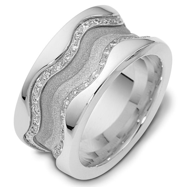 18K white gold, 11.5 mm wide, 3 mm thick comfort fit, diamond band, 0.50 ct tw. The diamonds are VS1-2 in clarity and G-H in color. The center portion of the ring has a mixture of coarse and heavy sandblast finishes. The edges are polished. Different finishes may be selected or specified.