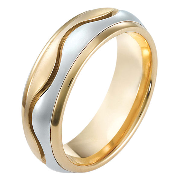 18 kt two-tone hand made comfort fit Wedding Band 7.0 mm wide. The center of the band is matte and the outer edges are polished. Different finishes may be selected or specified.