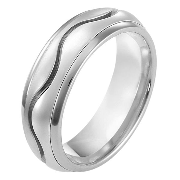 18 kt white gold, hand made comfort fit Wedding Band 7.0 mm wide. The center of the band is matte and the outer edges are polished. Different finishes may be selected or specified.