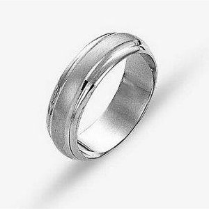 14 kt white gold, hand made comfort fit Wedding Band 6.0 mm wide. The center of the ring is a satin matte finish and the outer edges are polished. Different finishes may be selected or specified.