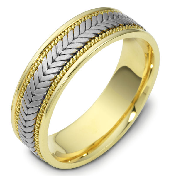 18 kt two-tone hand made comfort fit Wedding Band 7.0 mm wide. The ring has a handmade braid in the center with one hand crafted rope on each side of the the braid. The center is matte and the outer edges are polished. Different finishes may be selected or specified.