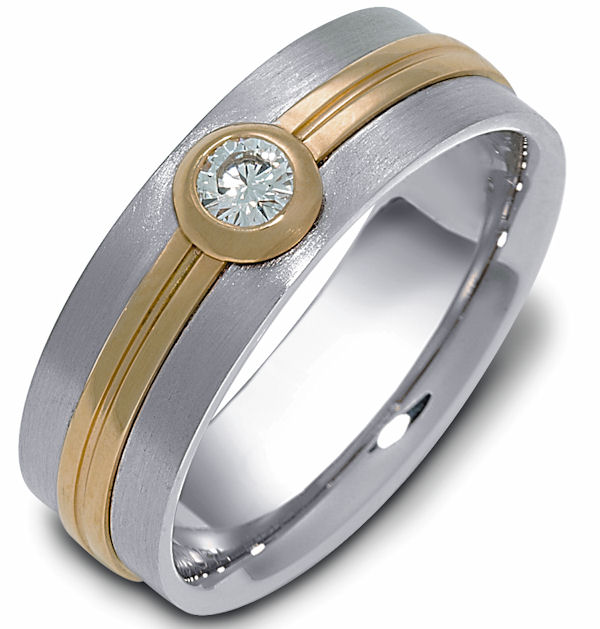 18 K two-tone 6.0 mm wide, 0.15 ct center VS1 in clarity H in color diamond ring. The bezel around the diamond and the center are polished. The rest of the ring is a satin brush finish. Different finishes may be selected or specified.