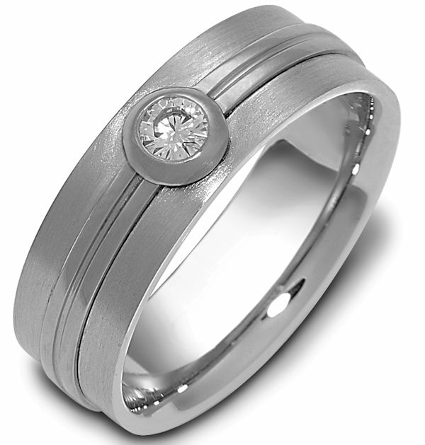 18 K white gold, 6.0 mm wide, 0.15 ct center VS1 in clarity H in color diamond ring. The bezel around the diamond and the center are polished. The rest of the ring is a satin brush finish. Different finishes may be selected or specified.