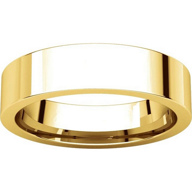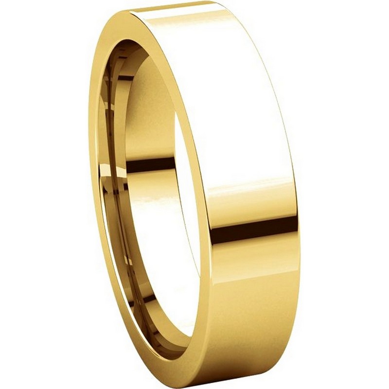 14K yellow gold comfort fit, 5.0 mm wide, flat, plain wedding band. The ring is completely polished. Different finishes may be selected or specified.
