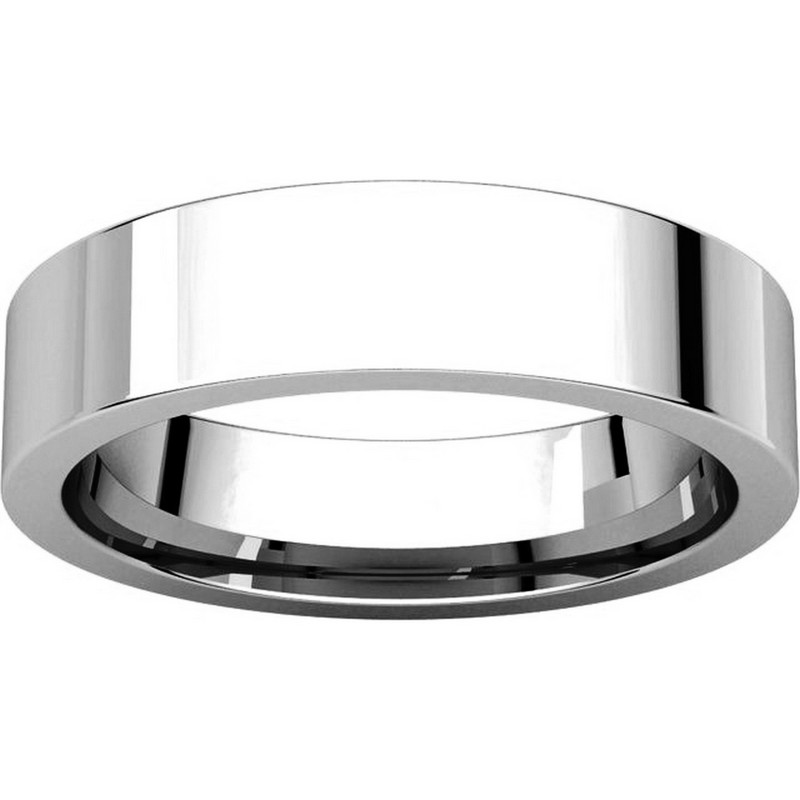 Platinum Plain 5.0 mm Wide Flat Comfort Fit Wedding Band. The ring is completely polished. Different finishes may be selected or specified.