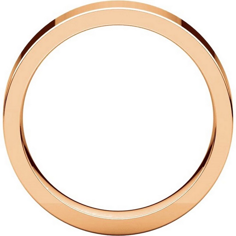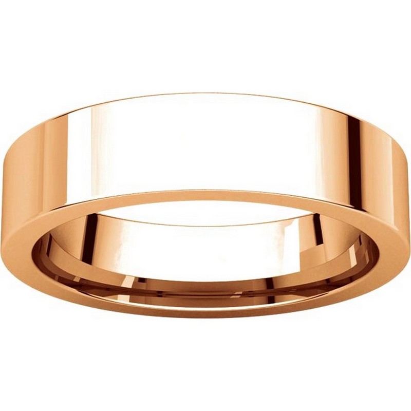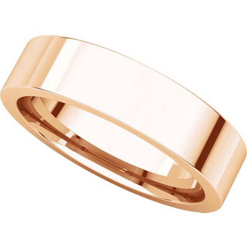 14 kt Rose Gold comfort fit, 5.0 mm wide, flat, plain wedding band. The ring is completely polished. Different finishes may be selected or specified.