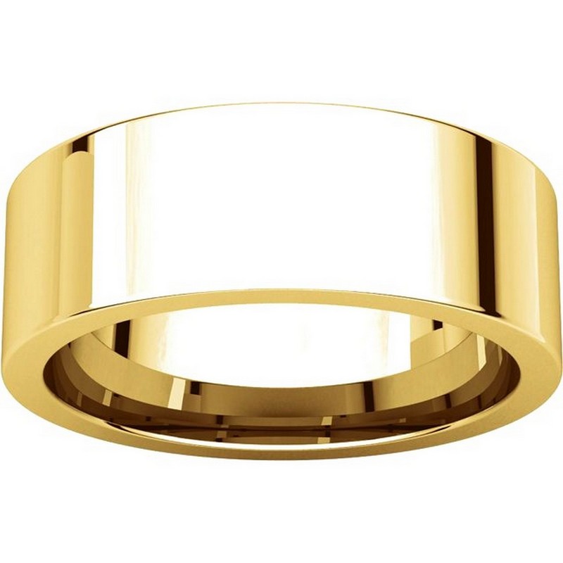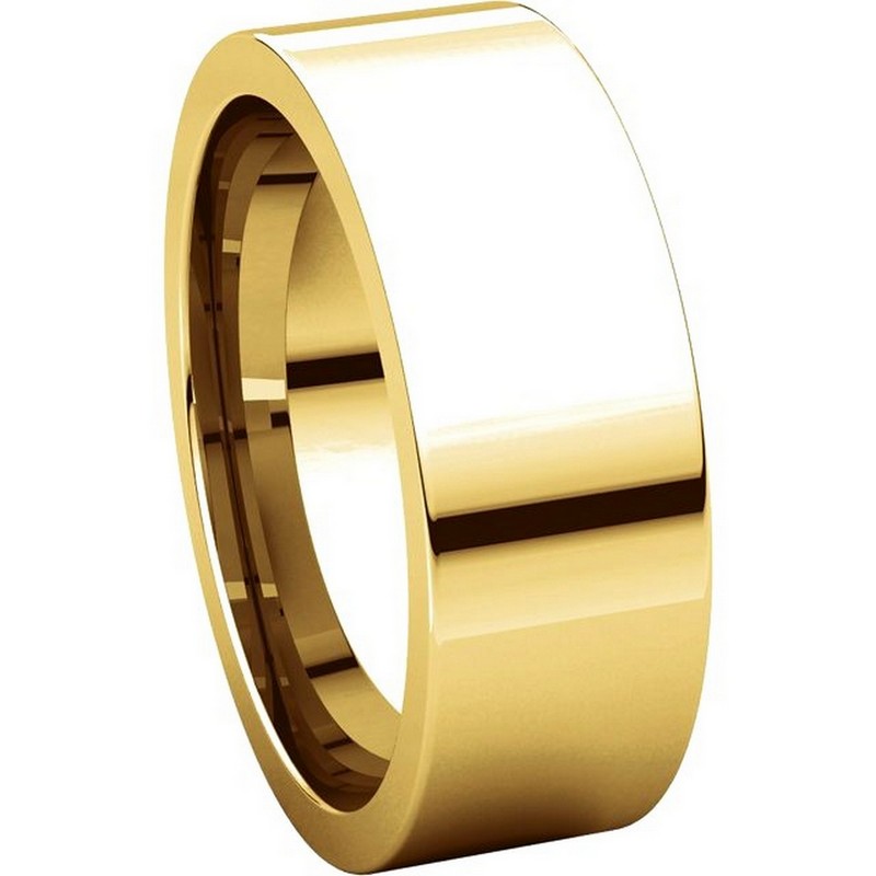 14K gold, plain, 7.0 mm wide, flat, comfort fit wedding band. The ring is completely polished. Different finishes may be selected or specified.