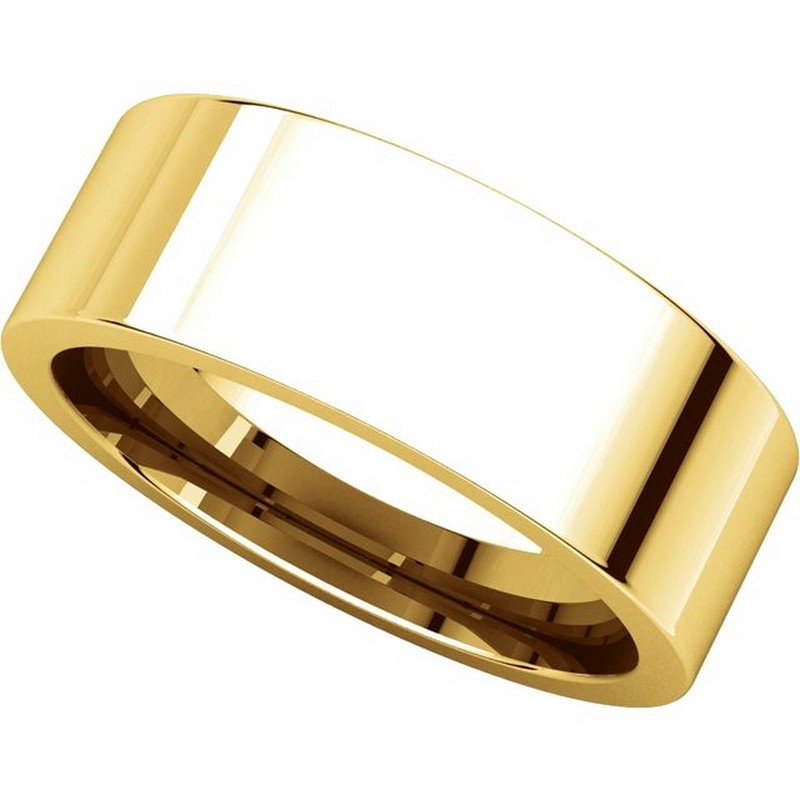 18K Yellow gold, plain, 7.0 mm wide, flat, comfort fit wedding band. The ring is completely polished. Different finishes may be selected or specified.