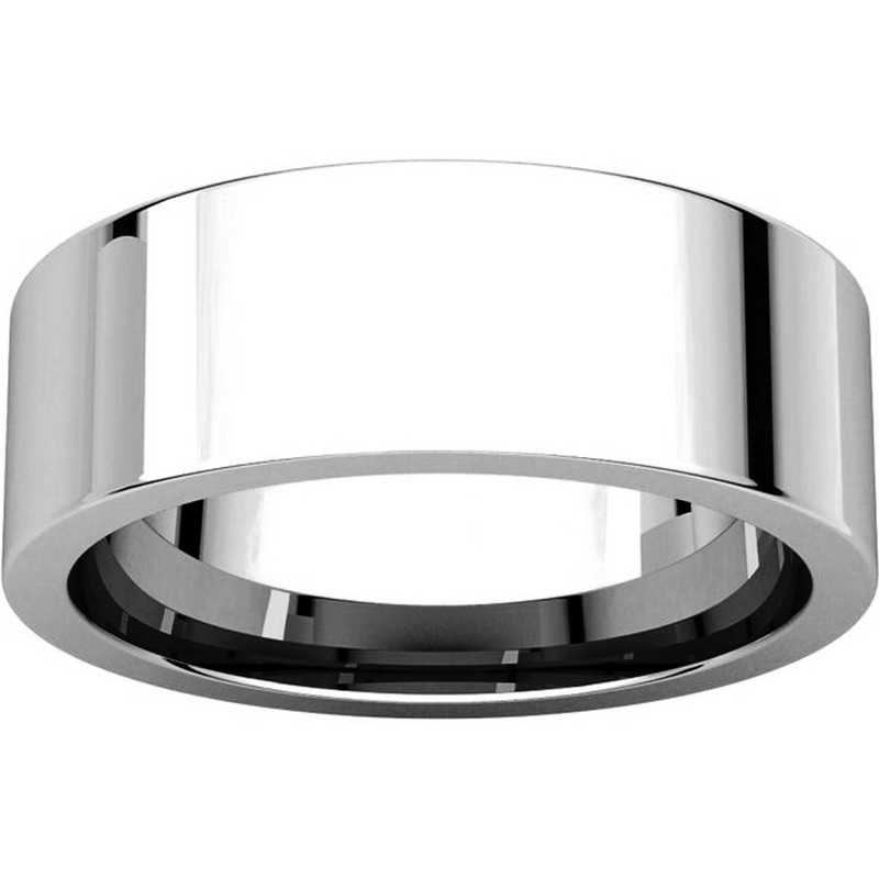14K white gold, plain, 7.0 mm wide, flat, comfort fit wedding band. The ring is completely polished. Different finishes may be selected or specified.