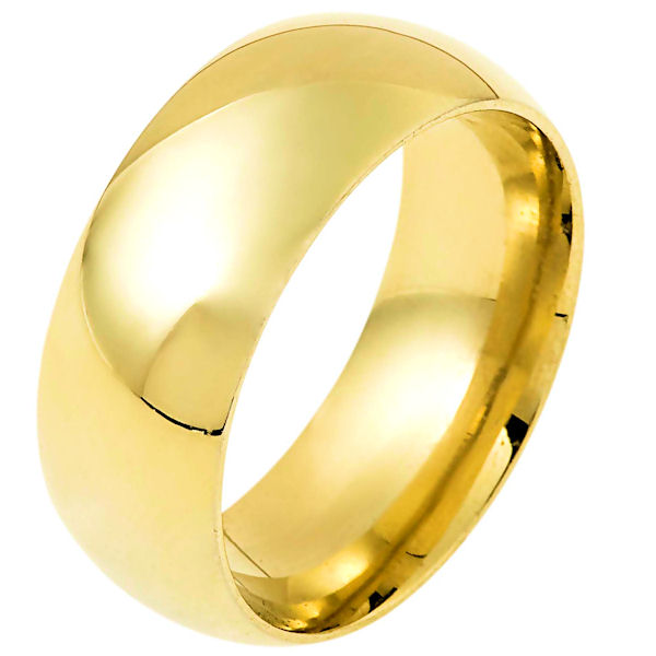 14 kt gold plain 9.0 mm wide half Round, high dome wedding band. The ring is completely polished. Different finishes may be selected or specified.