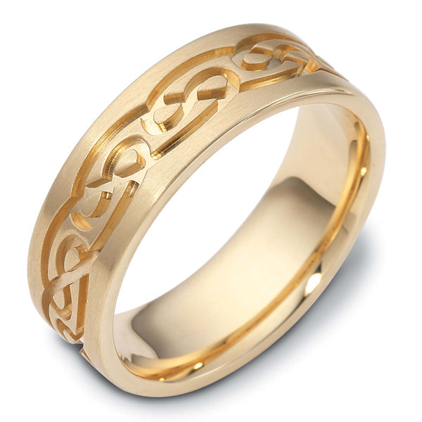 14 K yellow gold, 7.0 mm wide, comfort fit, carved with Celtic wedding band. The ring has Celtic carved designs around the ring. It is matte finish. Different finishes may be selected or specified.